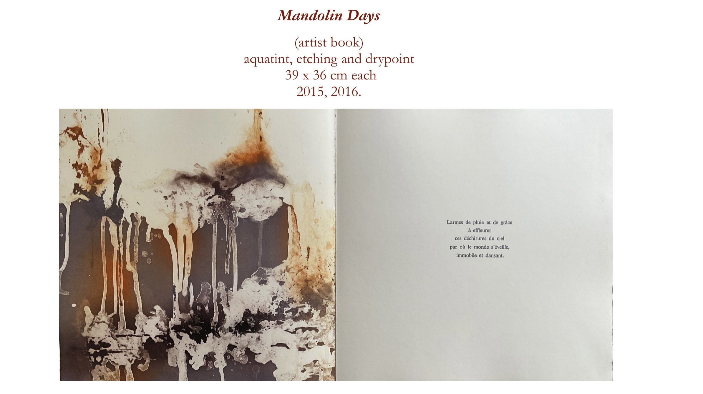 According to the theoretical approach developed in my doctoral thesis Entendre le pictural (Université Paris 1 Panthéon-Sorbonne), my artistic research accentuates and pursues the rhythmic qualities of printmaking. The aim is to suggest movement and inconsistency by irregular patterns and shapes, achieved through several etching techniques and revisited during the printing process.