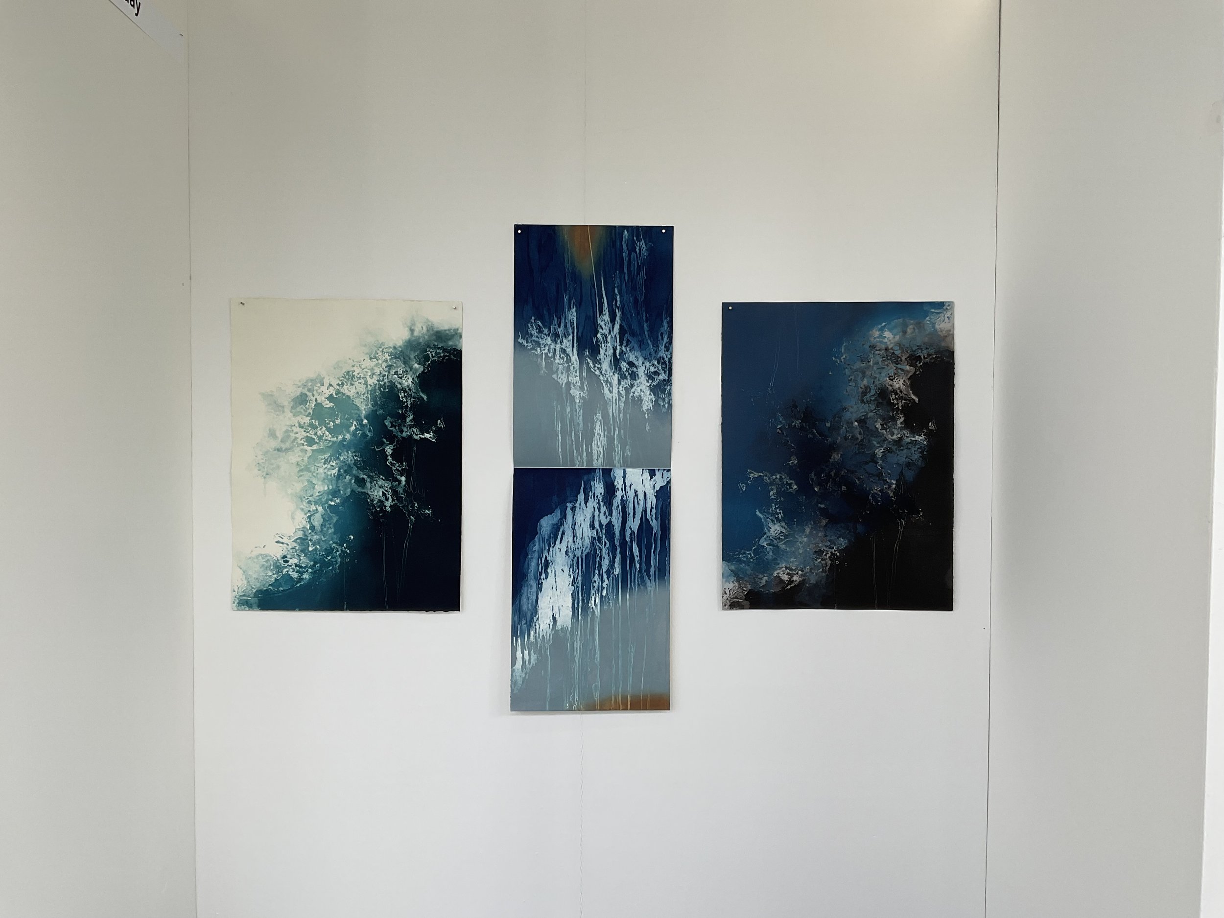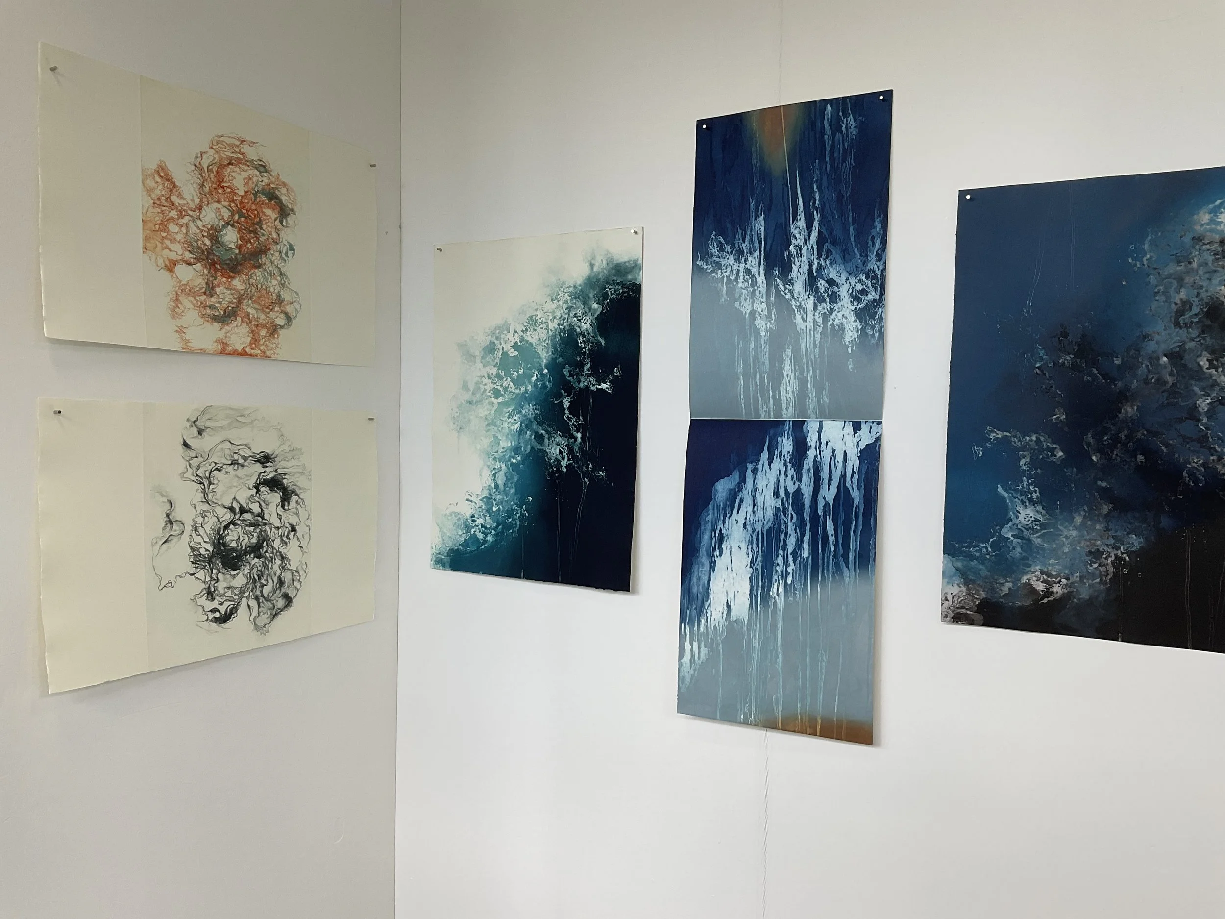 At the time of their production, I think of the prints as so many units converging into a suite, presented in variable and modular sequences according to the exhibition space. Once hung in a sequence, each piece stands as a fragment and responds to each other by alternating configurations. The insistence and repetition of visual elements produce a rhythmic tension, between impermanence and renewal.